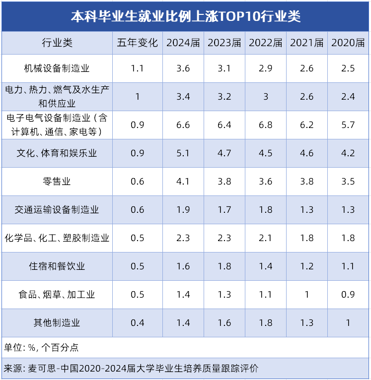 对于面对升学选择的高中生而言,专业的挑选关乎将来的职业成长轨迹。领会当下及将来的就业趋向,找准那些人才需求兴旺、成长潜力凸起的行业,近五年,我国本科结业生就业市场一批行业类凭仗强劲的成长动力,成为吸纳结业生的主要阵地。接下来小优将为你细致解读就业比例上涨TOP10行业类,找准适配的专业标的目的,为你的升学规划供给参考。这10个行业类的分布特征明显:制制业相关行业占领从导,涵盖机械设备、电子电气设备等多个细分范畴,占TOP10中的6席。这一态势表现了我国制制业转型升级成效,高端配备制制、同时,能源保障、消费升级、平易近生办事等类行业的稳步增加,也为大师将来职业选择供给了更多元标的目的,这些增加显著行业对应的专业范畴,值得沉点关心。机械设备制制业是支持国平易近经济成长的主要根本财产,当前正加快向高端化、智能化、绿色化转型,笼盖工业出产、根本设备扶植等多个环节范畴,高端配备制制、细密仪器研发等标的目的对本科手艺人才的需求持续攀升。该专业是机械类的保守王牌专业,焦点是培育控制机械设想、制制工艺和从动化节制等分析能力的手艺人才。学生将进修若何设想合适需求的机械产物,优化出产工艺流程,处理出产中的手艺难题,具备从产物研发到出产落地的全流程参取能力。报考需具备结实数学、物理根本,力学学问尤为环节。升入大学后需注沉实践,积极参取尝试、工业练习取学科竞赛,考取CAD工程师认证提拔合作力。就业面广,可入职汽车制制、工程机械、航空航天等企业,处置机械设想、工艺、设备办理等岗亭,需留意部门岗亭需驻厂或深切车间,工做相对艰辛,做息需贴合出产节拍,报考前可提前领会。做为一门融合机械工程、从动化手艺、计较机科学的交叉学科,智能制制工程专业,聚焦于数字化工场扶植和智能配备研发,旨正在培育可以或许使用先辈手艺对保守出产模式进行升级主要根本财产,渗入于出产糊口各范畴。近年来正在精细化工财产沉点搀扶、新材料手艺立异鞭策下,行业正向高端化、绿色化转型,新材料研发、保守产物升级等需求,该专业是化工行业的焦点专业,培育控制化学工程道理、化工工艺设想、化学反映工程、化工设备等学问的手艺人才,学生将具备化工出产流程设想、工艺优化、化工设备研发等分析能力,是支持行业出产和手艺升级的焦点人才。报考需结实化学、数学根本,沉点控制无机化学、无机化学学问。大学进修中注沉尝试取练习,参取化工出产练习、工艺设想项目堆集经验,树立绿色化工取平安出产。就业可入职中石化、中石油等大型化工企业,及精细化工、新材料企业,处置工艺工程师、出产手艺办理、产物研发等岗亭,也可进入环保部分担任化工废水、废气处置,职业笼盖面广,不变性强。