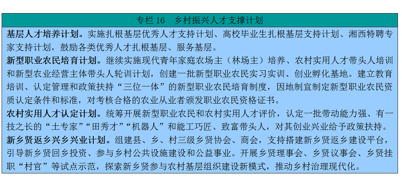优化农村成长外部,健全完美体系体例机制和政策系统,激发农村内糊口力,激活市场、激活要素、激活从体,促使人才、本钱、手艺流向农业农村,为村落复兴注入新动能。加速推进户籍轨制,全面实行栖身证轨制,推进有能力正在城镇不变就业和糊口的农业转移生齿有序实现市平易近化,保障进城农村生齿根基权益。162。实行宽松落户政策。鞭策有能力正在城镇不变就业和糊口的农业转移生齿进城落户,指导农业转移生齿正在就业地城镇、特别正在县城以下的小城镇落户。优先处理农村塾生升学、参业进入城镇、正在城镇就业栖身5年以上和举家迁移的农业转移生齿及重生代进城务工人员落户问题。分类制定落户政策,沉点处理合适前提的通俗劳动者落户问题。163。完美激励机制。不得要求进城落户农人让渡农村地盘承包运营权、集体收益分派权、宅利用权,或将其做为进城落户前提。成立进城落户农人 “三权”和志愿有偿退出机制。全面实行栖身证轨制,确保享受的各项根基公共办事和处事便当取城镇居平易近根基同步。164。确保随迁后代受教育权。通过多种体例添加学位供给,保障进城务工人员随迁后代以流入地公办学校为从接管权利教育,以公办长儿园和普惠性平易近办长儿园为从接管学前教育。加强中小学生学籍办理,充实使用全国中小学生学籍消息办理系统,为进城落户农人后代转学升学供给便当。165。平等享受根基公共办事。把进城落户务工人员完全纳入城镇住房保障系统,对合适前提的采纳多种体例保障根基住房需求。将农业转移生齿纳入社区卫生和打算生育办事系统,供给根基医疗卫生办事。把进城落户务工人员完全纳入城镇社会保障系统,正在农村加入的养老安全和医疗安全规范接入城镇社会保障系统,做好根基医疗安全关系转移接续和异地就医结算。实行愈加积极、愈加、愈加无效的人才政策,落实芙蓉人才步履打算,激励和指导各类人才投身村落扶植,鞭策村落人才复兴,充实阐扬才正在村落复兴中的支持感化。166。构成准确用人导向。把到农村一线熬炼做为培育干部的主要路子,形才向农村下层一线流动的用人导向。加大机关优良青年干部到乡镇交换任职力度,拓宽县级“三农”工做部分和乡镇干部来历渠道,健全从优良村党组织当选拔乡镇带领干部、考录乡镇公事员、聘请乡镇事业编制人员轨制。扩大乡镇公事员考录规模,落实贫苦县乡镇公事员考录政策,恰当降低进入门槛和开考比例,可拿出必然的职位照应本市州、县市区户籍人员。摸索正在深度贫苦县采纳单设职位招录乡镇公事员。167。关亲爱护下层干部。环绕下层需求,精选内容,加强教育培训。全面提拔“三农”干部步队的能力和程度。制定乡镇清单和义务清单,切实减轻下层承担,激励泛博下层干部新时代新担任新做为,让下层干部工做有动力、待遇有保障、事业有奔头。168。抓好科技人才步队扶植。加速领甲士才培育和立异团队扶植,实施湖南农业科研精采人才和精采青年科学家项目,对正在湘国度农业科研精采人才实行不变性支撑,鼎力引进海外高条理农业科技人才,培育一批具有国际影响力的农业科学家。完美县、乡、村农技农机推广收集系统,实施“农技推广培育打算”。全面实施农技推广办事特聘打算,摸索公益性和运营性农技农机推广融合成长机制。推进万名专家办事下层,统筹选派科技副县长、科技专家办事团团长、科技特派员工做,团队式、成建制鞭策科技人才向贫苦县、贫苦村全笼盖。答应科技专家办事团、科技特派员、“三区”(边远贫苦地域、边陲平易近族地域和老区)科技人才、下层科技人员供给增值办事合理取酬。鞭策科技专家办事团带动10000名科技人员办事农业农村。推进省科技转移示范县扶植,引进培育科技办事机构80家,培育下层科技立异创业人才2000人。169。强化专业人才步队扶植。继续实施“扎根下层优良人才”支撑打算。落实好“三区”人才支撑打算,继续实施“三支一扶”“杰出农林人才教育培育打算”“农村订单定向医学生、师范生免费培育”等,每年定向培育师范生8000名、医学生1500名。依托电视大学系统和职业院校培育5万名农人大学生。恰当放宽持久正在贫苦县和下层一线工做的专业手艺人才职称评定前提,侧沉现实工功课绩和办事下层年限、结果。全面奉行下层卫生专业手艺人才职称轨制。成立农村下层紧缺专业门类“定向评价、定向利用”的高级专业手艺职称评审办理轨制。逐渐实行晋升高级职称须有1年以上下层一线工做履历的要求。开展农村适用人才带头人培训,认定一批为农业出产办事带动能力强、有一技之长的“土专家”“田秀才”“机械人”,成立3个省级高尺度的农村适用人才带头人和大学生村官示范培训。实施村落工匠培育工程和农业领甲士才培育打算,搀扶培育一批农业职业司理人、经纪人、电子商务师、文化强人、非遗传人。170。培育新型职业农人。实施新型职业农人培育工程,支撑新型职业农人通过弹性学制加入中高档农业职业教育。完美公益性农人培训轨制,实施新型农业运营从体带头人轮训、现代青年农场从培育、农村适用人才带头人培训和农村青年创业致富“领头雁”培育打算。建立以农业学校、职教核心、涉农高档院校为从体,农业科研院所、农人专业合做