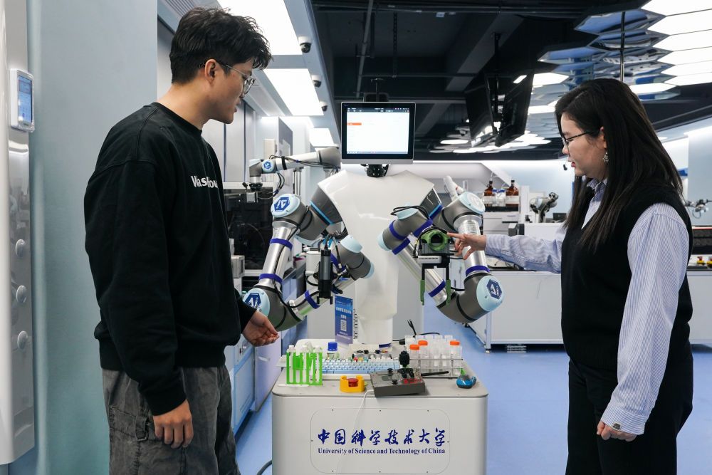 2025年11月24日,中国科学手艺大学精准智能化学全国沉点尝试室特任传授朱濯缨(左)取博士生郭露露正在“机械化学家”小临前进行营业切磋。